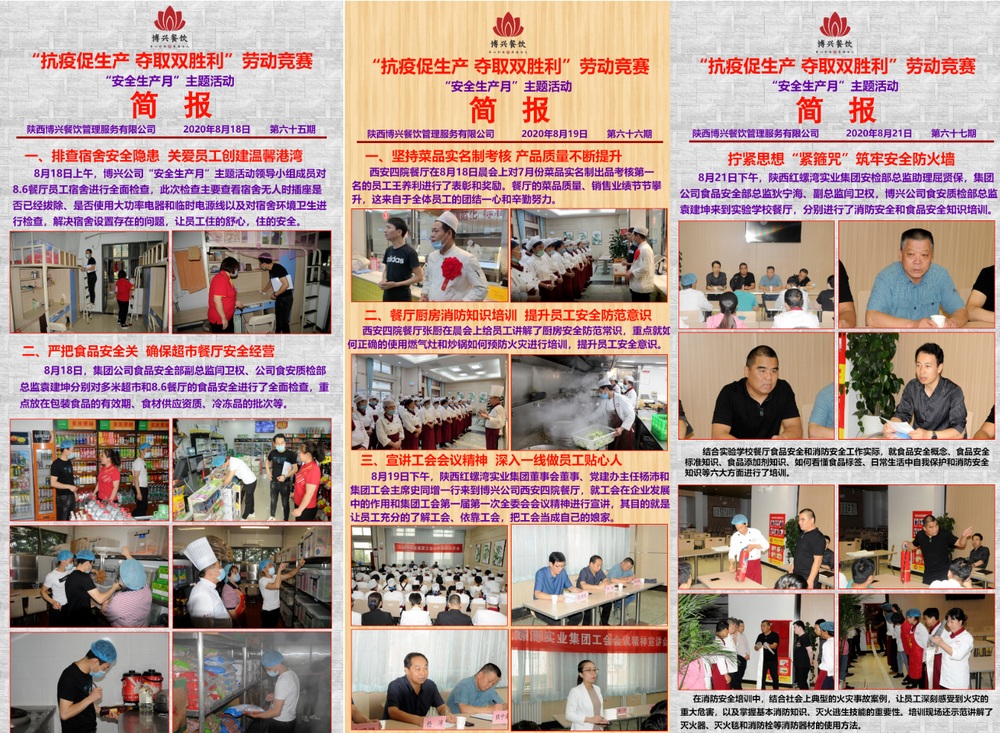 2020 年 8 月份“安全生产月”活动已圆满结束,达到了预期的效果。各项目将继续巩固成果,在下半年的工作中,要进行强化安全生产管理,落了实各项安全责任制,加强食品安全、消防安全、设施设备安全、人身安全、员工宿舍等安全管理,使安全监管常态化,确保各项目安全经营。